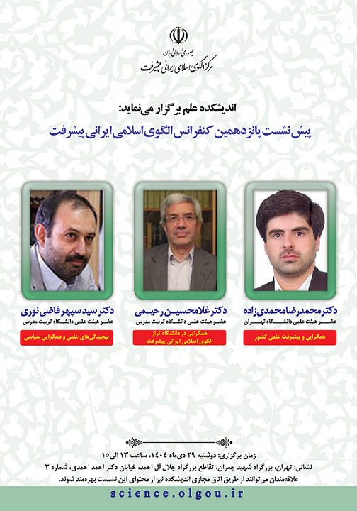 در این نشست آقایان دکتر سپهر قاضی نوری عضو اندیشکده علم الگوی اسلامی ایرانی پیشرفت و استاد دانشگاه تهران، دکتر علامحسین رحیمی عضو اندیشکده علم و استاد دانشگاه تربیت مدرس و دکتر محمدرضا محمدی زاده عضو اندیشکده علم و استاد دانشگاه تهران به سخنرانی میپردازند. این نشست در جمع اعضای اندیشکده علم الگوی اسلامی ایرانی پیشرفت و جمعی از اساتید،کارشناسان مرکز الگوی اسلامی ایرانی پیشرفت و علاقهمندان این حوزه برگزار میشود.