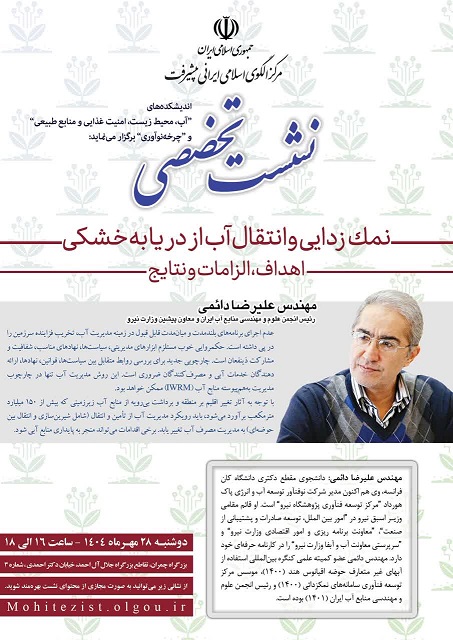 این نشست با سخنرانی، آقای مهندس‌علیرضا دایمی (رئیس انجمن علوم و مهندسی منابع آب ایران) و سخنرانی آقای دکترسعید مرید (استاد دانشگاه تربیت مدرس) در جمع اعضای اندیشکده‌های آب و محیط زیست، امنیت غذایی و منابع طبیعی و اندیشکده چرخه نوآوری، کارشناسان، دبیران و روسای اندیشکده‌های مرکز الگوی اسلامی ایرانی پیشرفت با موضوع "نمک زدایی و انتقال آب از دریا به خشکی، اهداف، الزامات، نتایج" برگزار می‌گردد.
